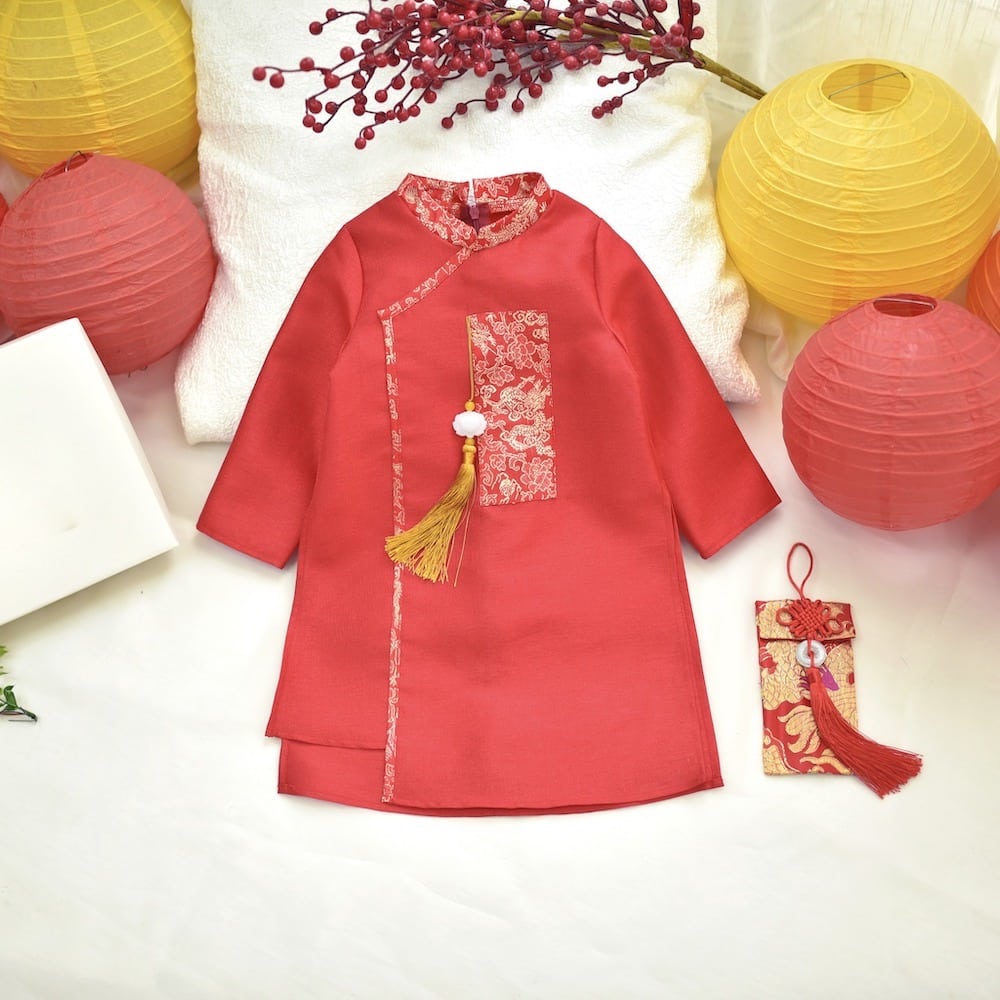 Bộ áo dài truyền thống cho bé trai với thiết kế cổ vuông, cùng với cúc màu đỏ chạy xéo xuống hong. Cùng với đó là họa tiết múa lân ngộ nghĩnh đáng yêu. Cùng với là quần lụa được may bó ống tạo sự gọn gàng, nổi bật cho bé. Đây là một trông mẫu áo dài cách tân bé trai hot nhất năm nay nhà Nhiên