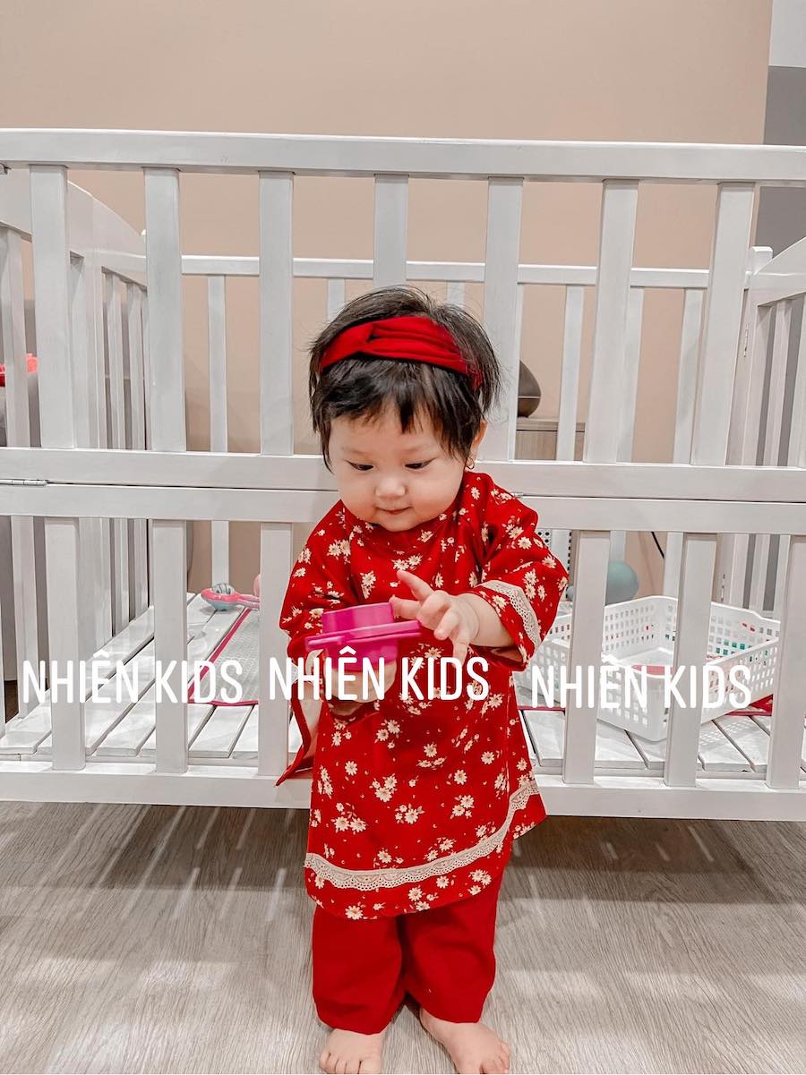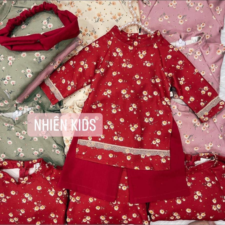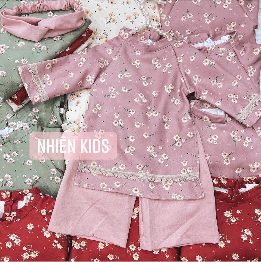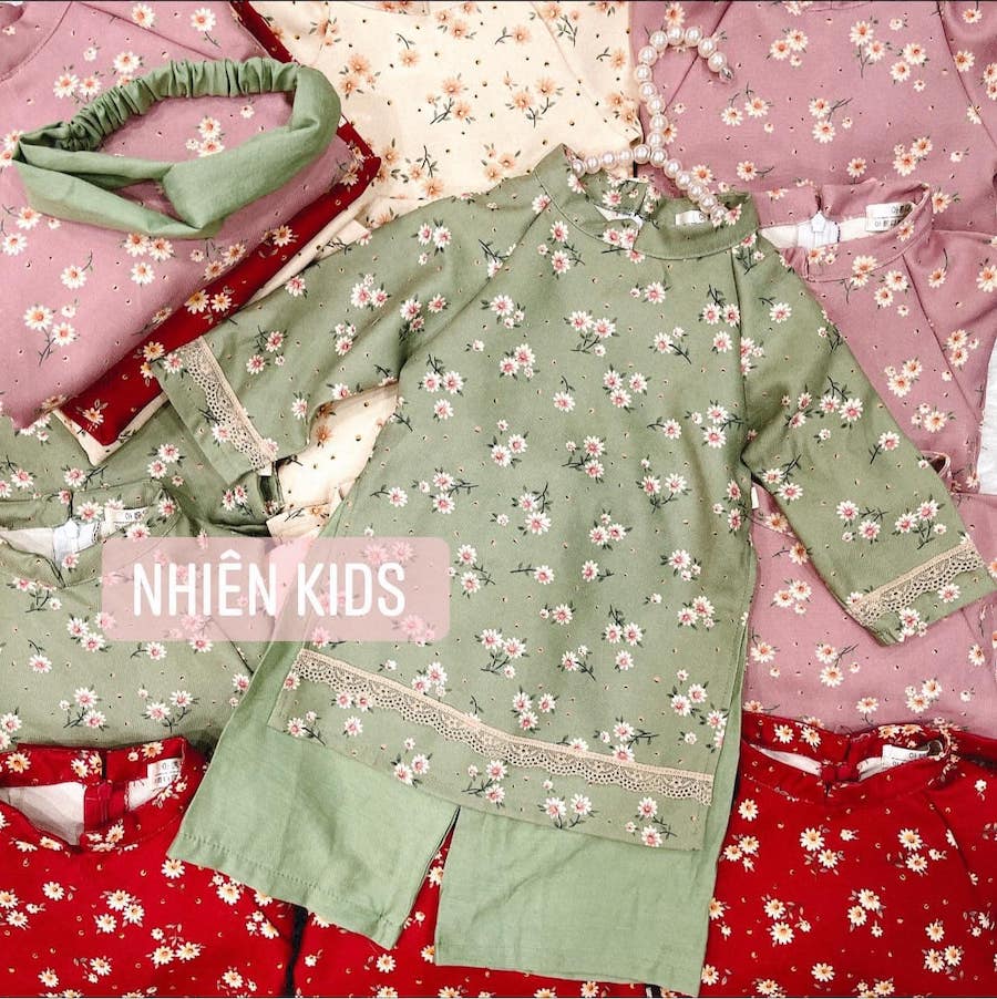 Bộ áo dài truyền thống bé gái hoa nhí được thiết kế dựa vào mẫu áo dài truyền thống. Kết hợp họa tiết hoa nhí hiện đại, cùng đường ren làm điểm nhấn. Đây là một trong mẫu áo dài đẹp nhất trong bộ siêu tập Áo dài tết 2022 nhà Nhiên.